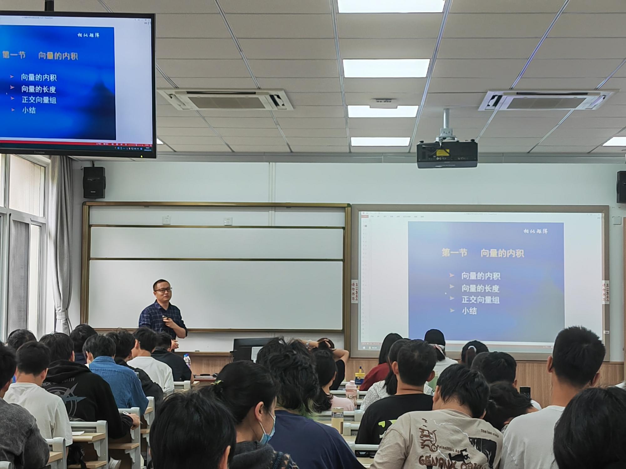 课程思政建设,促使专业教育与思政育人同向同行,5月19日上午,学院黎泽老师在北区3号教学楼202开展了一堂《线性代数B》的课程思政公开观摩课,学院20余名教师参加观摩学习。