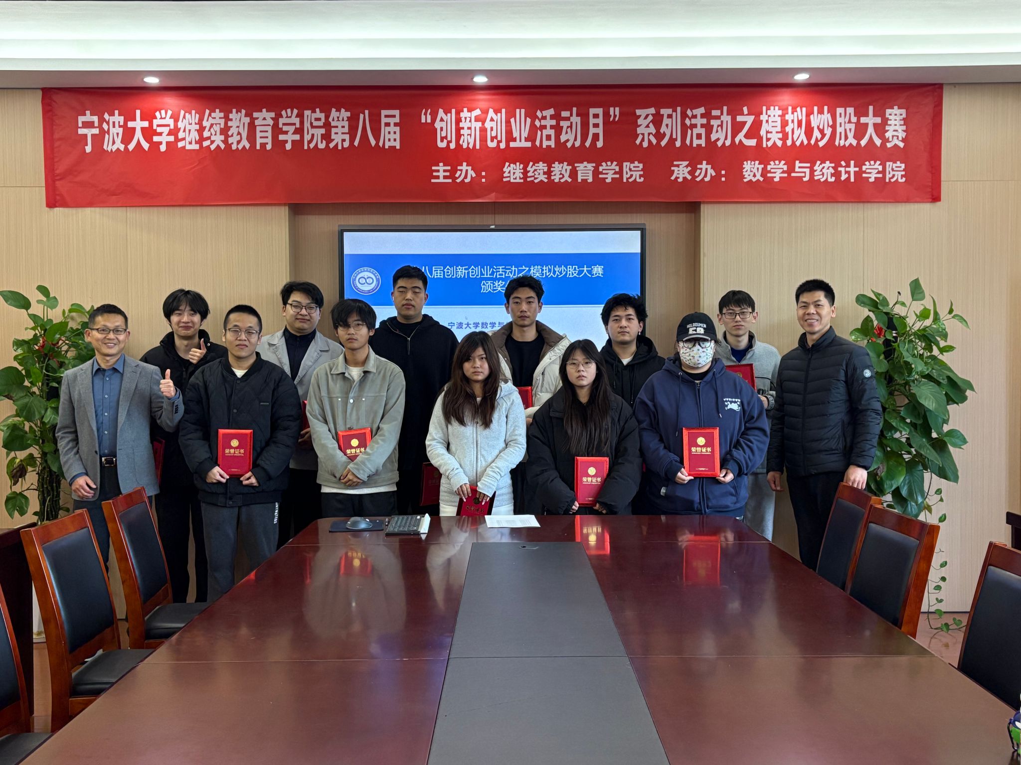 12月5日,大赛颁奖仪式在学院218会议室举行。学院分管领导、项目负责人、项目管理教师等代表及部分参赛学生共同出席仪式。仪式上,负责人肯定了参赛学生在模拟交易中展现出的市场洞察力与风险把控力,并结合当前金融市场趋势,为学生们提供了专业的投资建议与成长指导。鼓励他们以此比赛为契机,持续深化金融知识学习,不断提升实战能力。