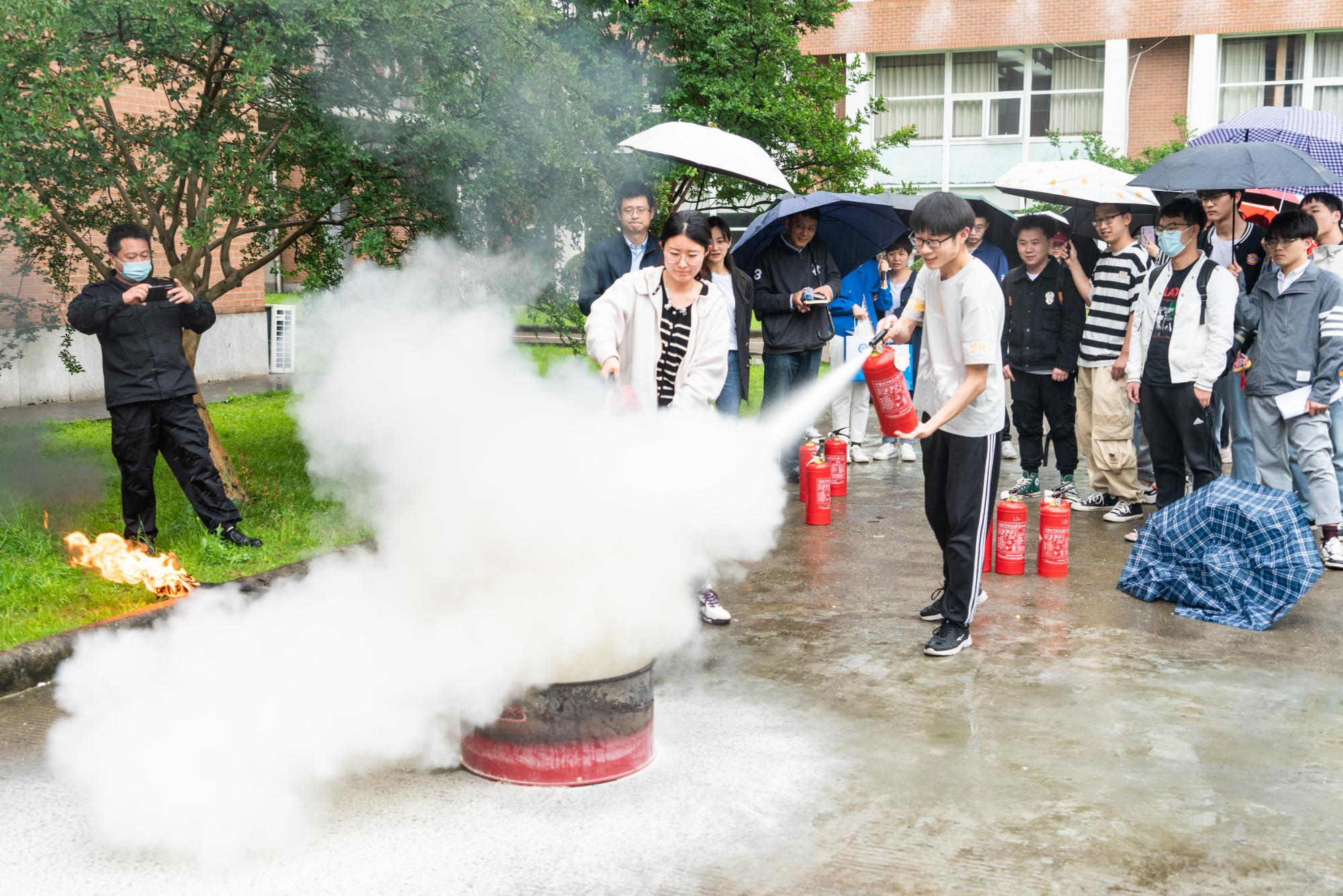 讲座结束后,在包玉书9号楼西面空地开展了消防演习活动。模拟小型火场,依次拔掉灭火器安全栓,对准烈火根部均匀喷洒,师生亲身体验了消防灭火的全过程。针对灭火器使用不规范的问题,老师进行了现场指导。整场演习有条不紊、井然有序。