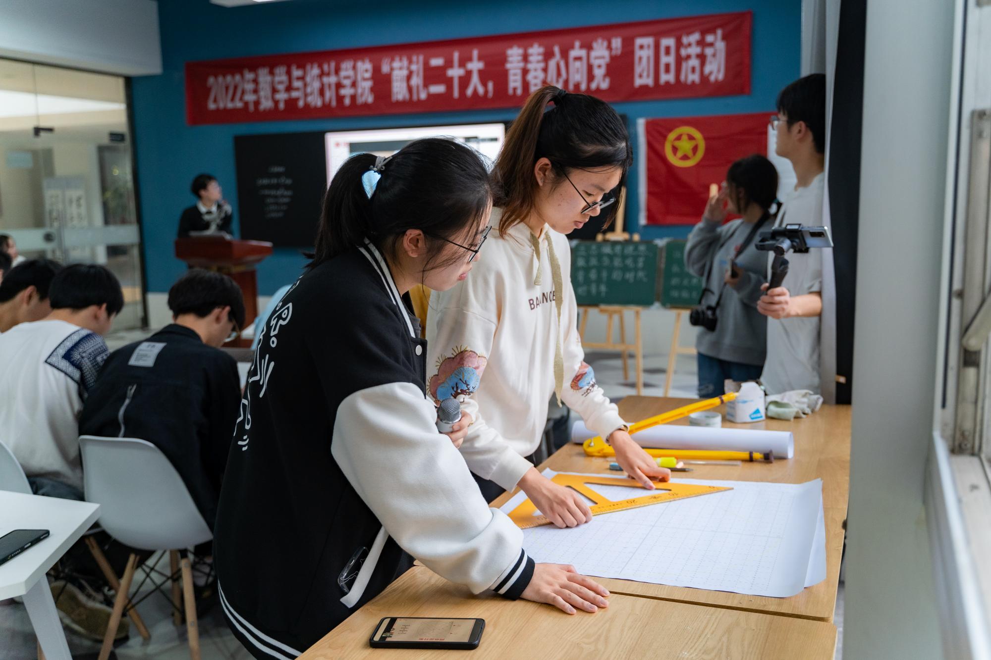 此外,数师的同学们也发挥专业特长,通过建立坐标系,用数学课堂中常用的教具带领三中的同学们共同绘制党徽,金黄的镰刀锤头明朗鲜艳,浓浓的爱党爱国之情顺着一条条直线和曲线在指尖流淌。