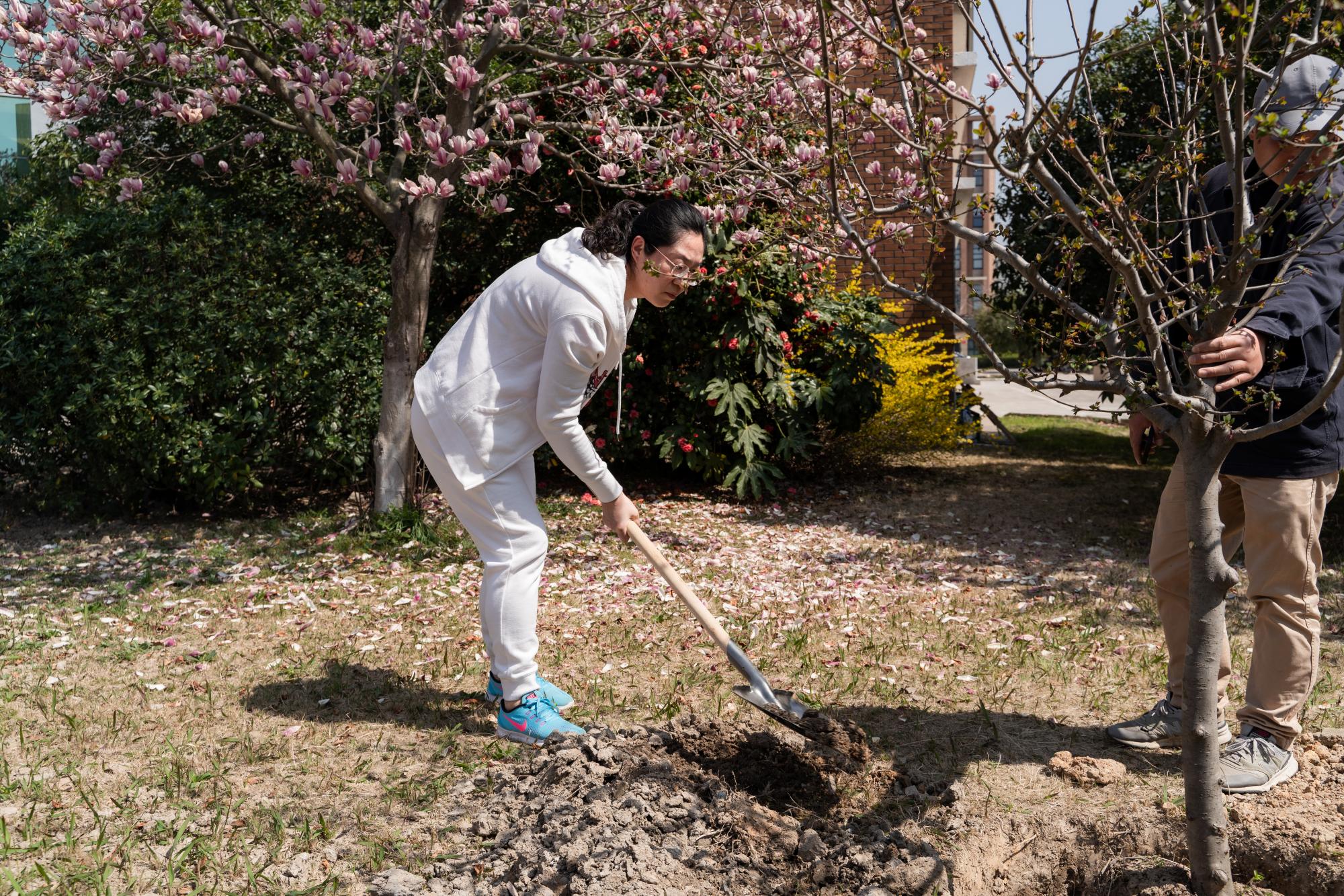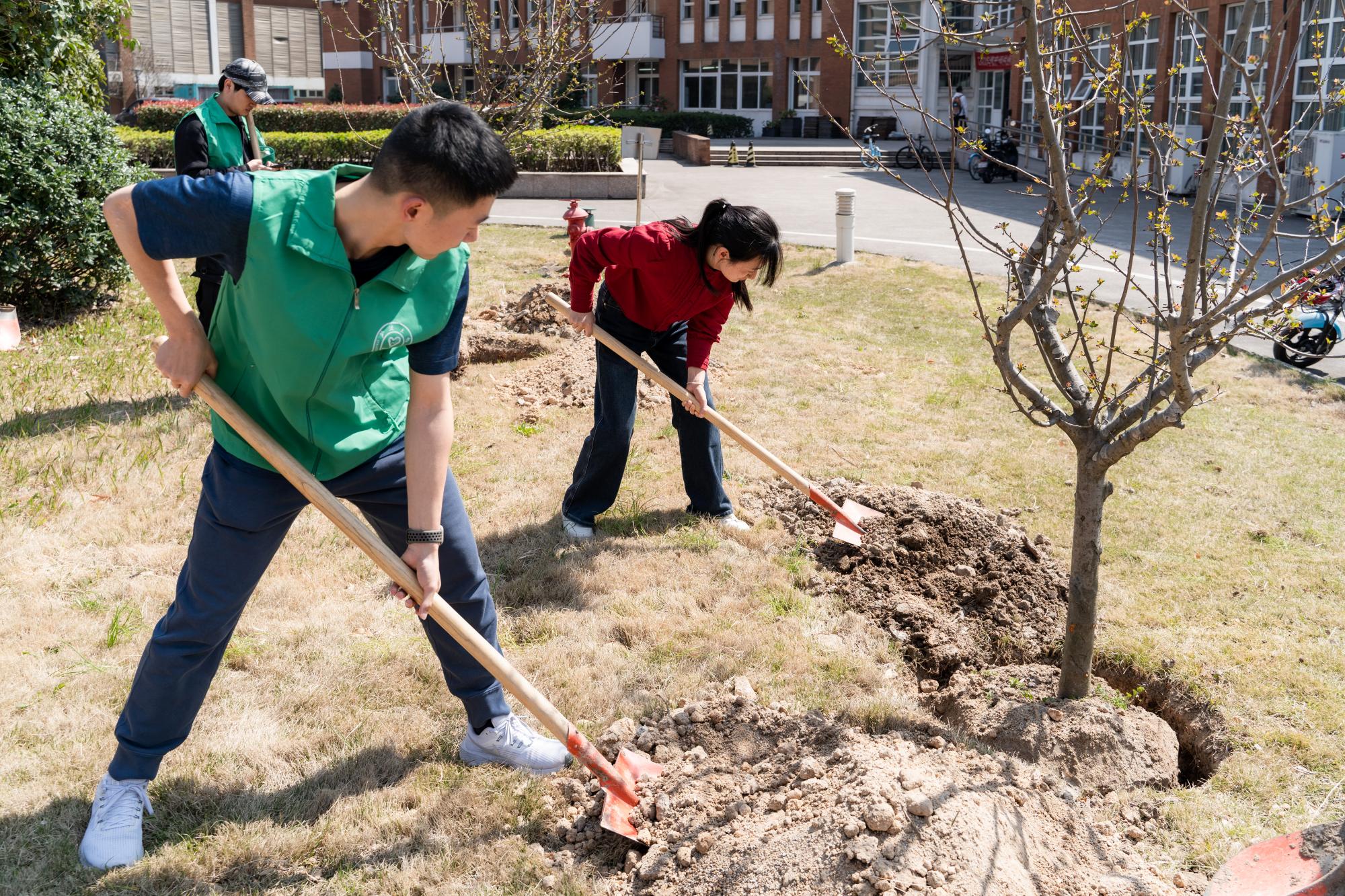 3月10日中午,在后勤老师的指导下,志愿者和老师们纷纷拿起铁锹投入到植树劳动之中,挥锹铲土、扶直树木、培实新土、提桶浇水,每项工作都做得认真仔细。志愿者们还在小树上系上为贵州省兴仁三中孩子们手写的明信片以表祝福。一棵棵稚嫩而挺拔的小树就这样“住进”校园,承载着同学们的希望在微风中挺立。植树结束后,志愿者们清理了学院周边绿化带的垃圾,检查绿化带花草树木的生长情况,并做好相应的记录。火辣辣的太阳和劳动后的汗水让志愿者们深刻体会到劳动者们的艰苦,但经过劳动变得干净整洁、生意盎然的校园环境抹去了一切疲惫,一抹抹充满活力的绿色留在了同学们的心底。