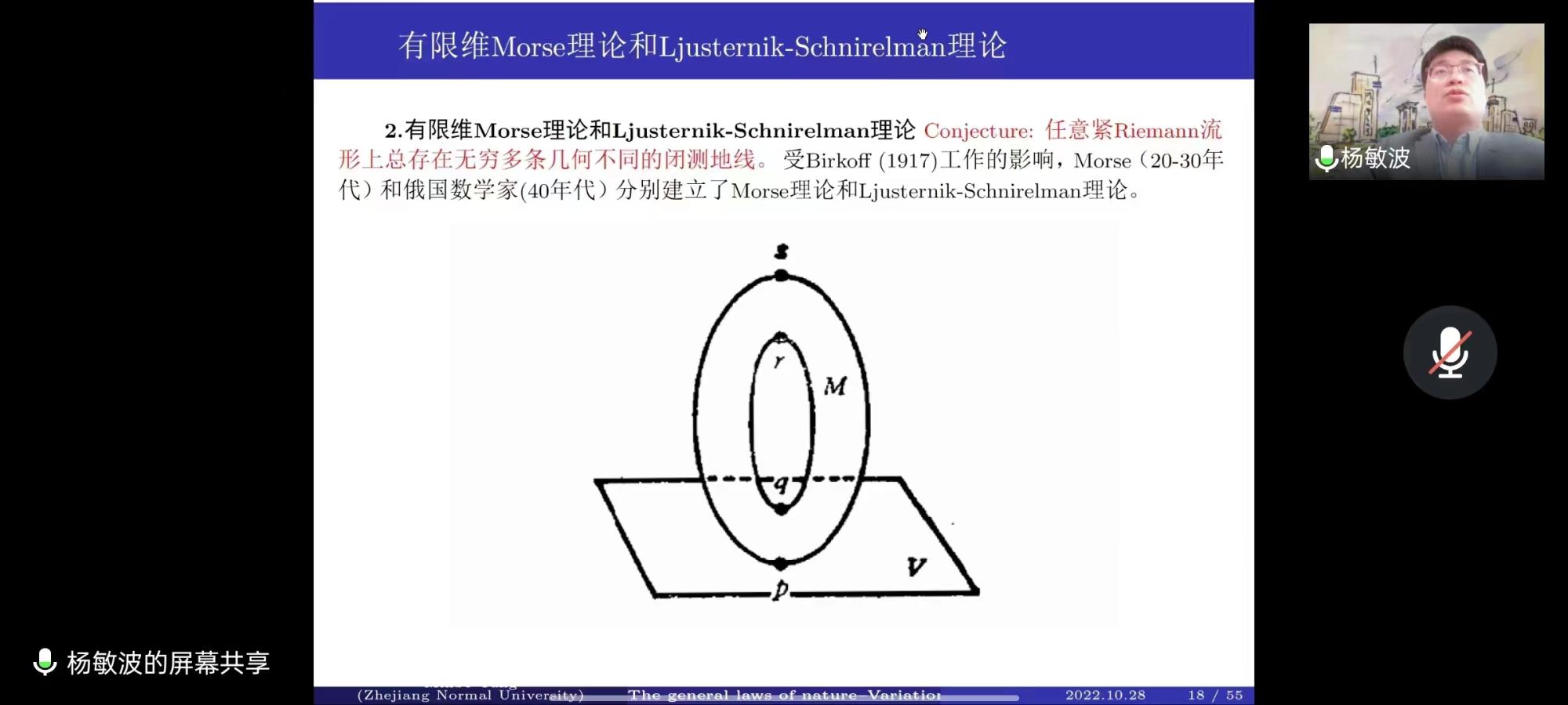 杨教授作了题为“The general laws of natur e- VariationalPrinciple”的精彩报告,全面梳理和深入探讨了变分法的起源、发展与应用。杨教授从欧拉的逼近方法、狄利克莱原理、有限维Morse理论、 Ljusternik- Schnirelman理论、 Berstein猜想、山路定理等详细展开变分法的起源与发展,并从Floer理论、Yamabe问题、薛定谔方程等方面讲解了变分法的应用杨教授表示要时刻关注着变分法的长远发展,要对数学问题深入研究,要为数学的发展做出贡献。同时,杨教授也对数学研究生们的学习提出了 几点建议:第一,要懂得读的书永远不嫌多,找老师永远不嫌少,在整个学习过程中要努力刻苦,认真仔细。第二,在数学研究中不能只追求写论文的速度,更要重视论文的质量。第三,如今数学的发展非常快,如果仅仅关注单一的研究方向,很有可能会被数学界所淘汰。他建议研究生们要打下扎实的基础,不仅要学习自己研究方向的知识,也要积极拓展知识面,了解数学各研究方向的内容,只要坚持不懈、刻苦钻研,一定可以取得令人满意的结果。
