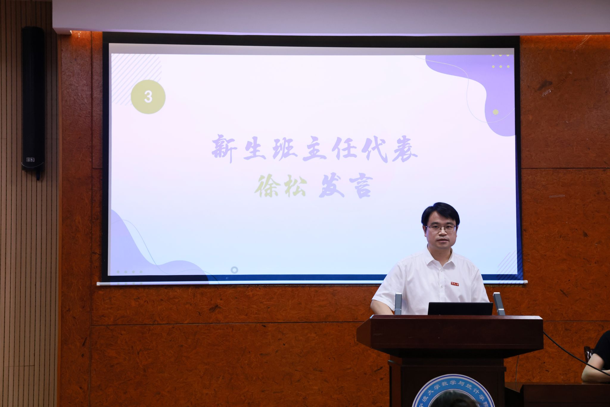 会上,2024级新生班主任徐松从班主任的视角以“如何做一个令人尊敬的宁大数学人”为主题发表讲话。徐老师表示,学习是数学人底色;自律是数学人的内蕴;思考是数学人的天性;格局是数学人的气质,并勉励各位同学成为令人尊敬的宁大数学人!来自2024级数学与应用数学拔尖人才创新班的本科学生代表方凯悦同学发言表示,关山既过,梦想不息,站在人生新的起点,应当把握新的机遇,开启新的征程。作为新生,要尽快适应新的环境,平衡好学习和生活,保持坚定的信念与勇气,向着数学的纯粹,迈出昂扬向前的步伐。2024级数学专业硕士研究生李帅作为研究生新生代表发言,他号召各位新生面对新的起点,秉持对数学的热爱,走好自己的路;处优而不养尊,受挫而不短,成为仰望星空、脚踏实地的宁大数院人。