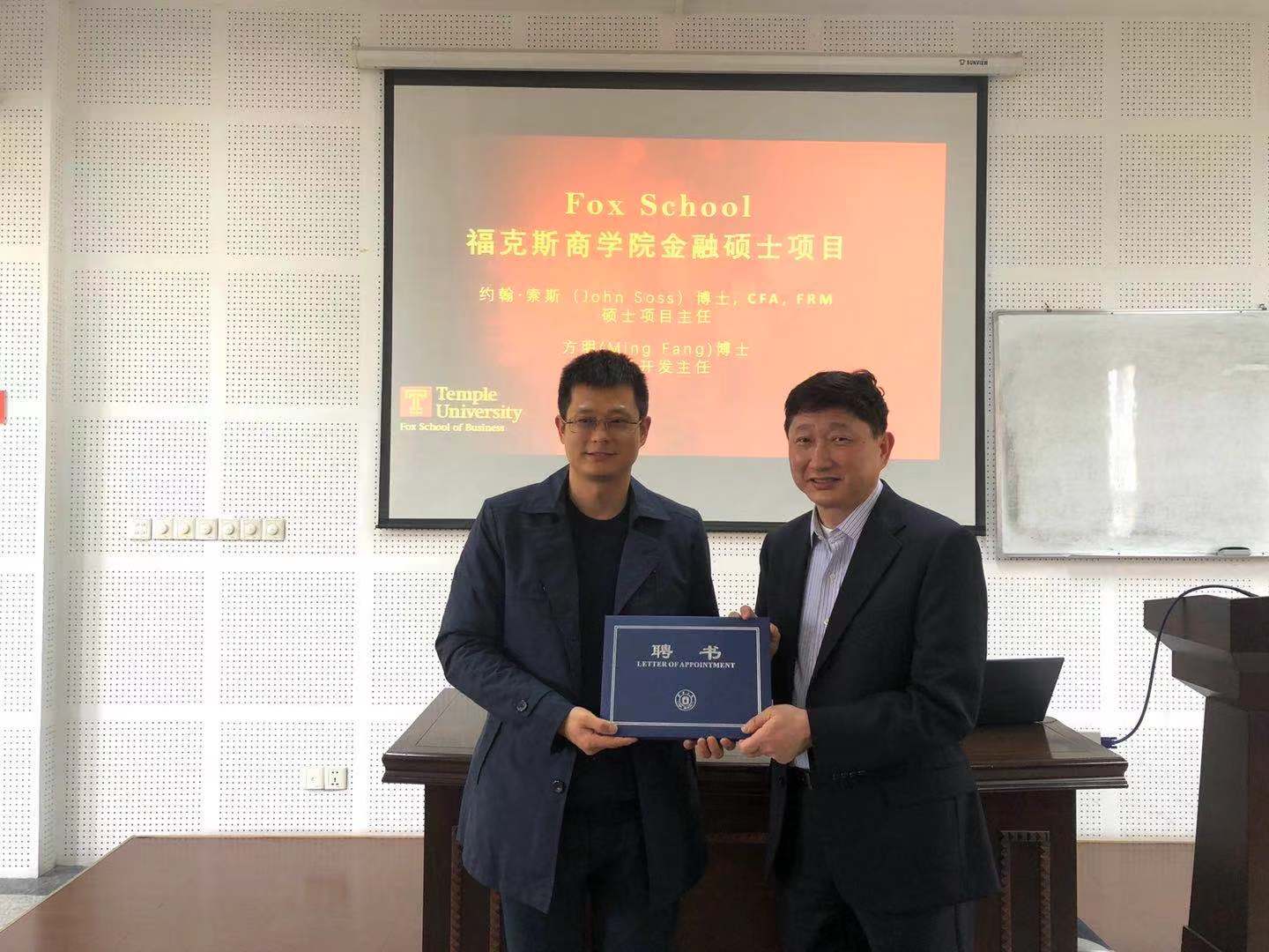 近日,美国天普大学的方明教授一行来av直播 交流,我院党委书记俞金波为天普大学方教授颁发了av直播 兼职教授聘书。方教授和SOSS教授给av直播 广大师生介绍了天普大学-av直播 合作项目。天普大学(Temple University)金融、精算相关专业有相当实力,与av直播 有长期合作关系,目前已有三位av直播 毕业生在天普大学深造。