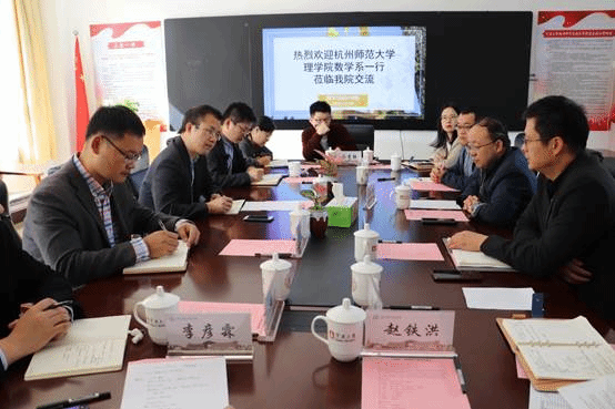 的办学历程、学科发展现状及未来规划;俞金波从学风建设、考研率提升等方面重点分享了学院人才培养的经验;院长助理分别介绍了学院的人才引进、科学研究、一流专业及中外合作项目的情况。徐衍聪一行对我院获批博士点表示祝贺,并介绍了杭州师范大学数学系的情况,并提出了发展过程中遇到的若干问题。