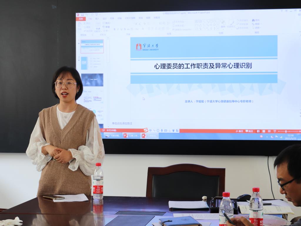 学生心理健康状况排摸月报表》,同时要加强对班级重点关注对象的帮扶。接下来,李媛媛向大家详细地讲解了大学生心理健康的重要性,她立足班级心理委员本职工作,结合多种心理健康问题的案例,与各班班主任和心理委员进行了深入交流。李老师表示要提高同学们受挫折能力和社会生活适应能力,减少产生心理障碍的隐患,提高心理健康水平。最后,姜萍总结发言。她希望各班班主任和心理委员能对各班学生心理健康情况高度重视,让同学们能更乐观自信,从而更好的认识自我,接纳自我,体验到自己存在的价值。会议在热烈的掌声中圆满结束。
