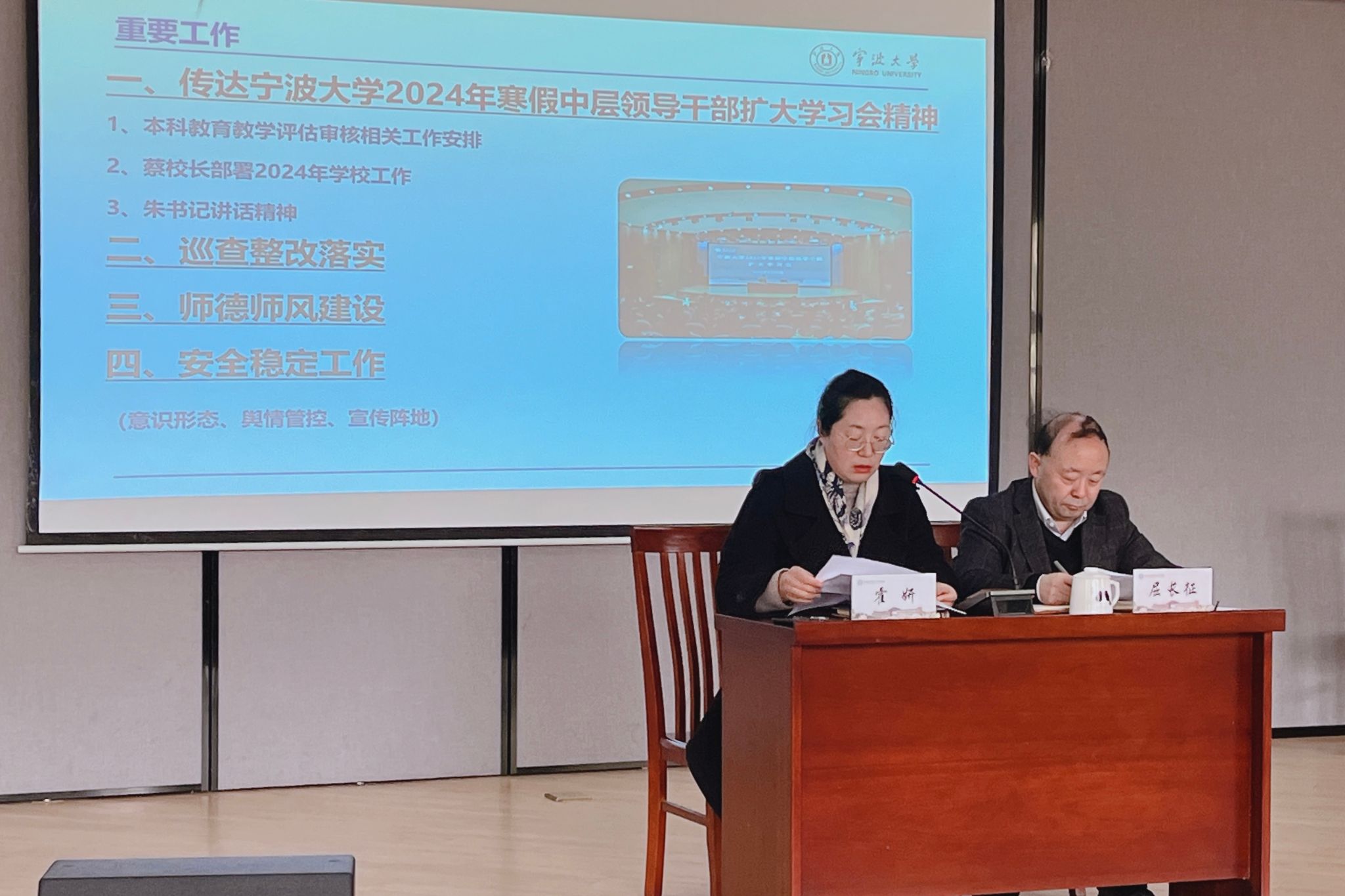 2024年寒假中层干部扩大学习会相关精神,她分享了校党委书记朱达关于“奋勇拼搏 实干争优 再谱学校高质量发展新篇章”主题报告的相关内容,并着重传达了朱达书记对学校整体工作的三点意见以及蔡荣根校长关于2024年学校的九项主要工作部署等相关精神,同时就吕朝锋副校长关于本科教育教学审核评估的时间节点及纪律要求进行了强调。在学院重点工作部署方面,霍妍指出迎接本科教育教学评估也是学院本学期最重要的工作之一,需要全员参与,要积极准备、认真迎评,同时她结合巡查整改落实强调了学院其他需要重点推进的工作。她指出学院的“三支队伍”要紧紧围绕工作的重点难点,聚焦聚力,真抓实干。此外,霍妍还就师德师风建设、安全稳定工作等进行了强调和部署。