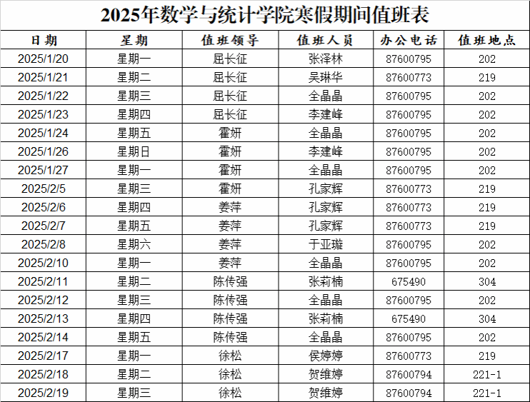 根据《av直播 校长办公室关于2025年寒假和假期值班工作安排的通知》中的安排,寒假期间,要求各单位、部门根据“不误办事”的原则,安排好假期值班工作。值班时间为每天8:30-16:00。具体安排如下: