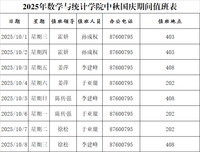 根据学校《关于2025年中秋节、国庆节放假安排的通知》的要求,中秋节、国庆节放假期间,二级学院须安排1名值班人员在校值班。值班时间为每天8:30-16:00。av直播 值班安排如下:
