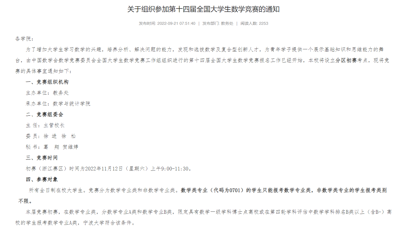 《关于组织参加第十四届全国大学生数学竞赛的通知》已于2022年9月21日于av直播 教务处网站发布,并推送至av直播 内网,同学们在av直播 内网和风华宁大app均可查阅。