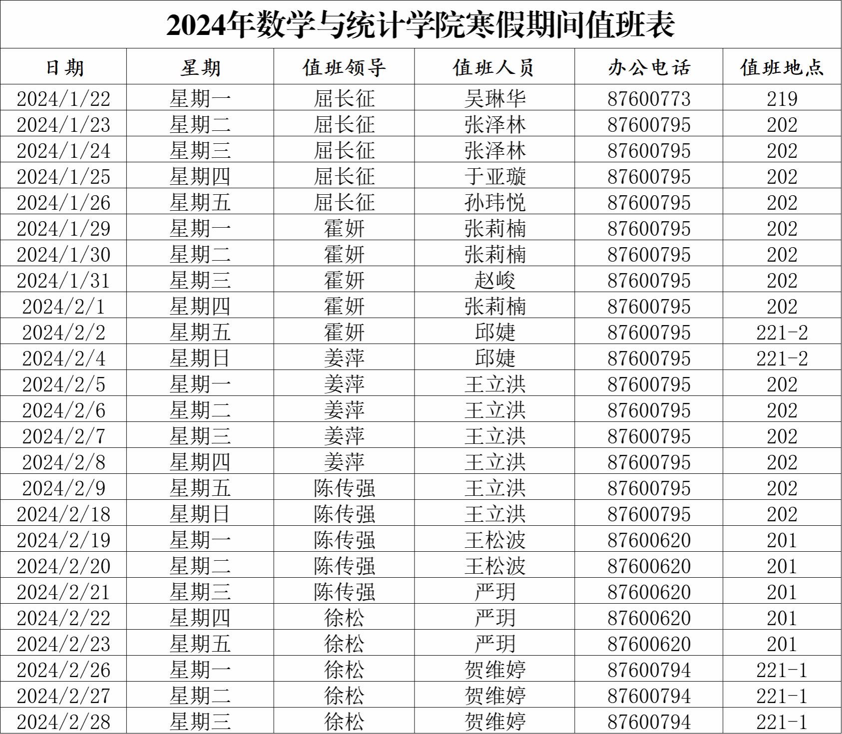 按照《av直播 校长办公室关于2024年寒假和假期值班工作安排的通知》中的安排,要根据“不误办事”的原则,安排好假期值班人员,确保工作日(农历正月初一至初八除外)有专人值班,值班时间为每天8:30-16:00。av直播 2024年寒假值班安排如下: