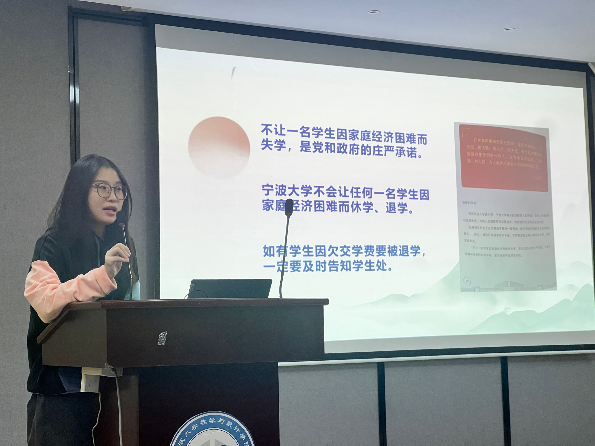宣讲会上,学生工作办公室侯婷婷老师详细解读了学校资助政策的核心内容。从国家助学金、国家助学贷款等国家级资助项目,到学校设立的助学金、勤工助学岗位等校内帮扶举措,再到临时困难补助、学费减免等应急保障政策,侯婷婷老师逐一梳理申报条件、申请流程及评审标准,确保政策细节清晰易懂。